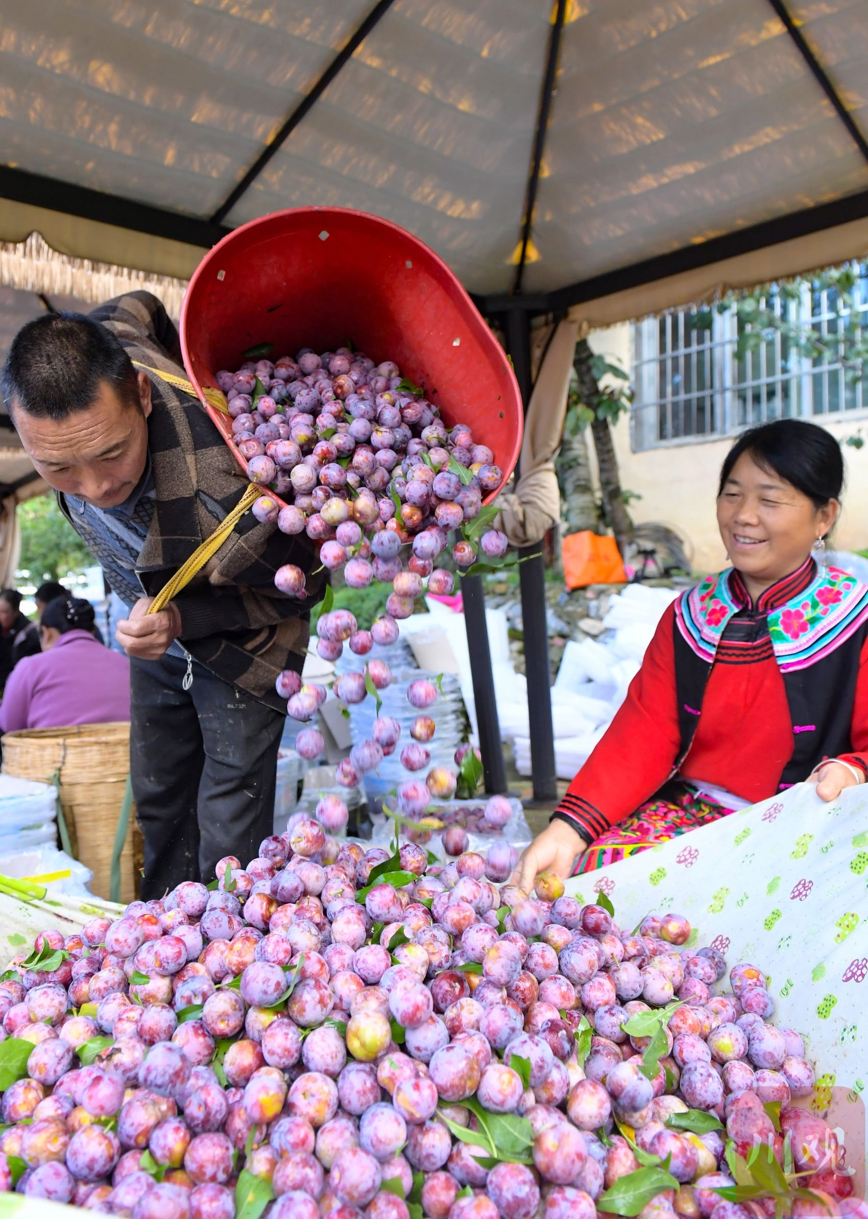 2025年9月23日,在四川省阿坝州汶川县威州镇萝卜寨村村民张路平的李子园,当地羌族村民在采摘脆李。