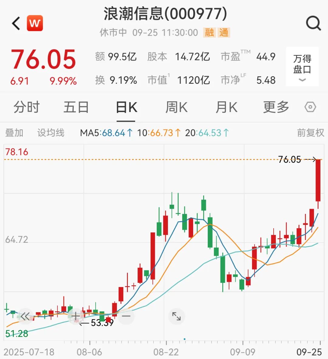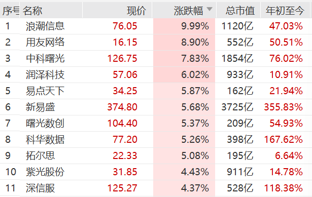 浪潮信息10cm涨停;用友网络一度涨停,截至午盘涨8.9%。