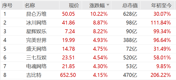 上午,游戏、电商概念股涨幅居前,昆仑万维大涨10.22%,冰川网络、星辉娱乐涨超8%,完美世界、盛天网络、三七互娱、电魂网络、吉比特涨超4%。