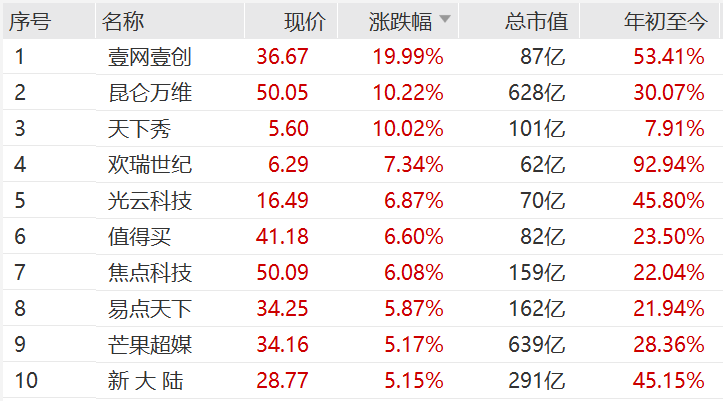 欢瑞世纪、光云科技、值得买涨幅居前。