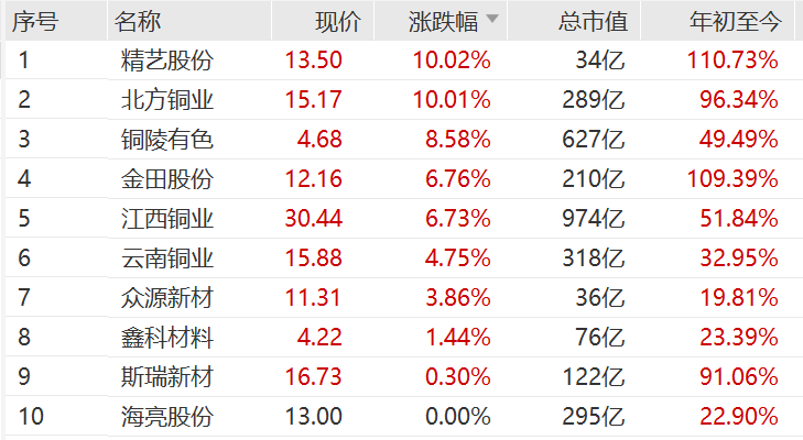北方铜业、精艺股份、洛阳钼业封死涨停。