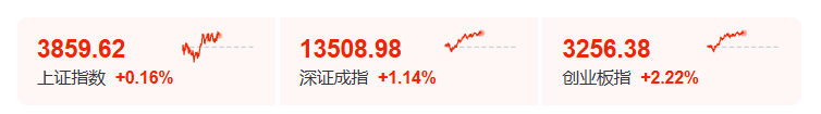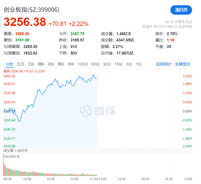 9月25日上午,A股三大股指集体上涨。截至午间收盘,沪指涨0.16%,深证成指涨1.14%,创业板指涨2.22%。