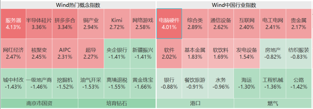 从板块看,电脑硬件、通信设备、互联网、电工电网、贵金属板块均涨超2%,而燃气、港口、工程机械、公路、海运等板块走弱。