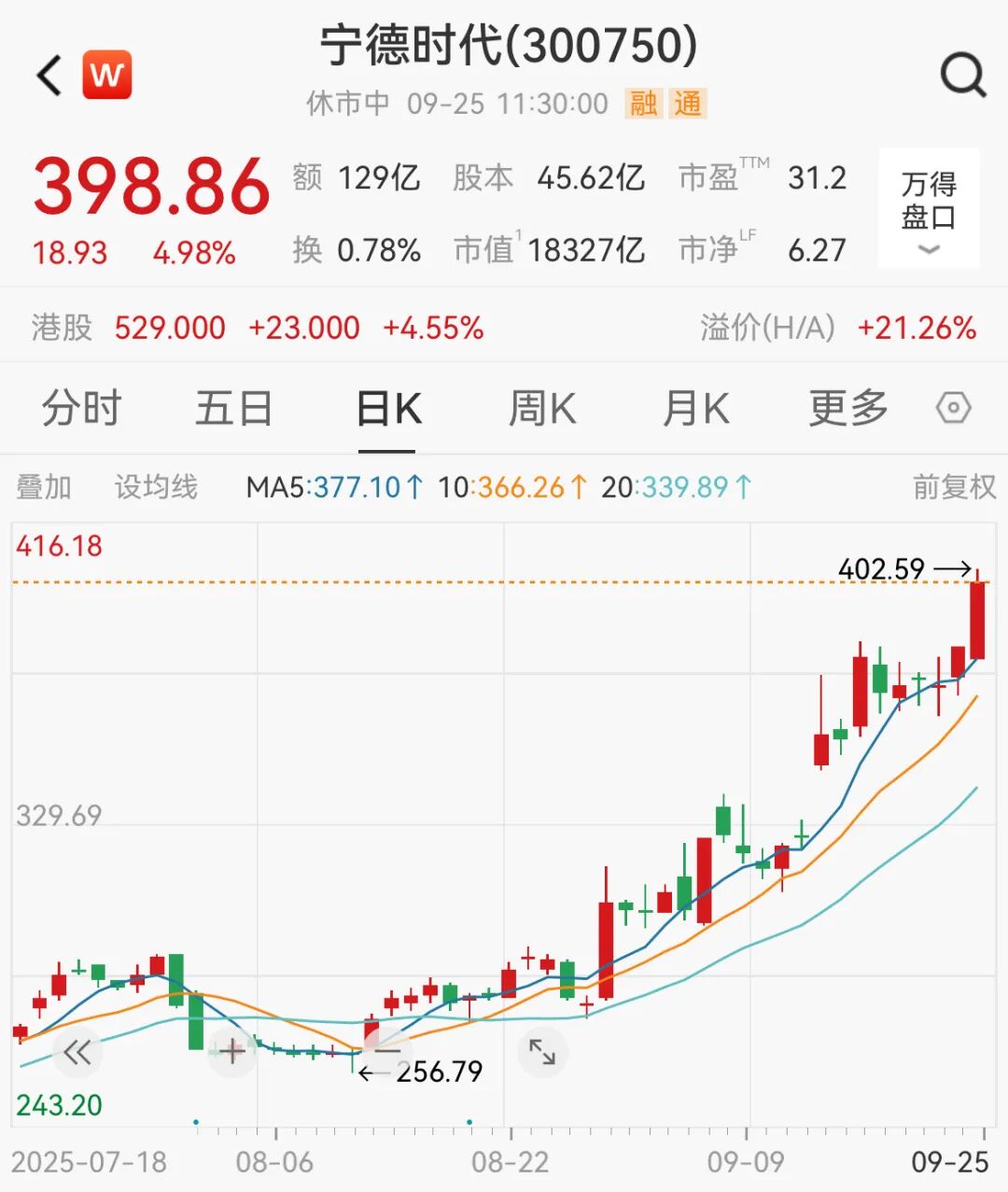 9月25日上午,宁德时代A股盘中涨幅一度接近6%,股价突破400元关口。