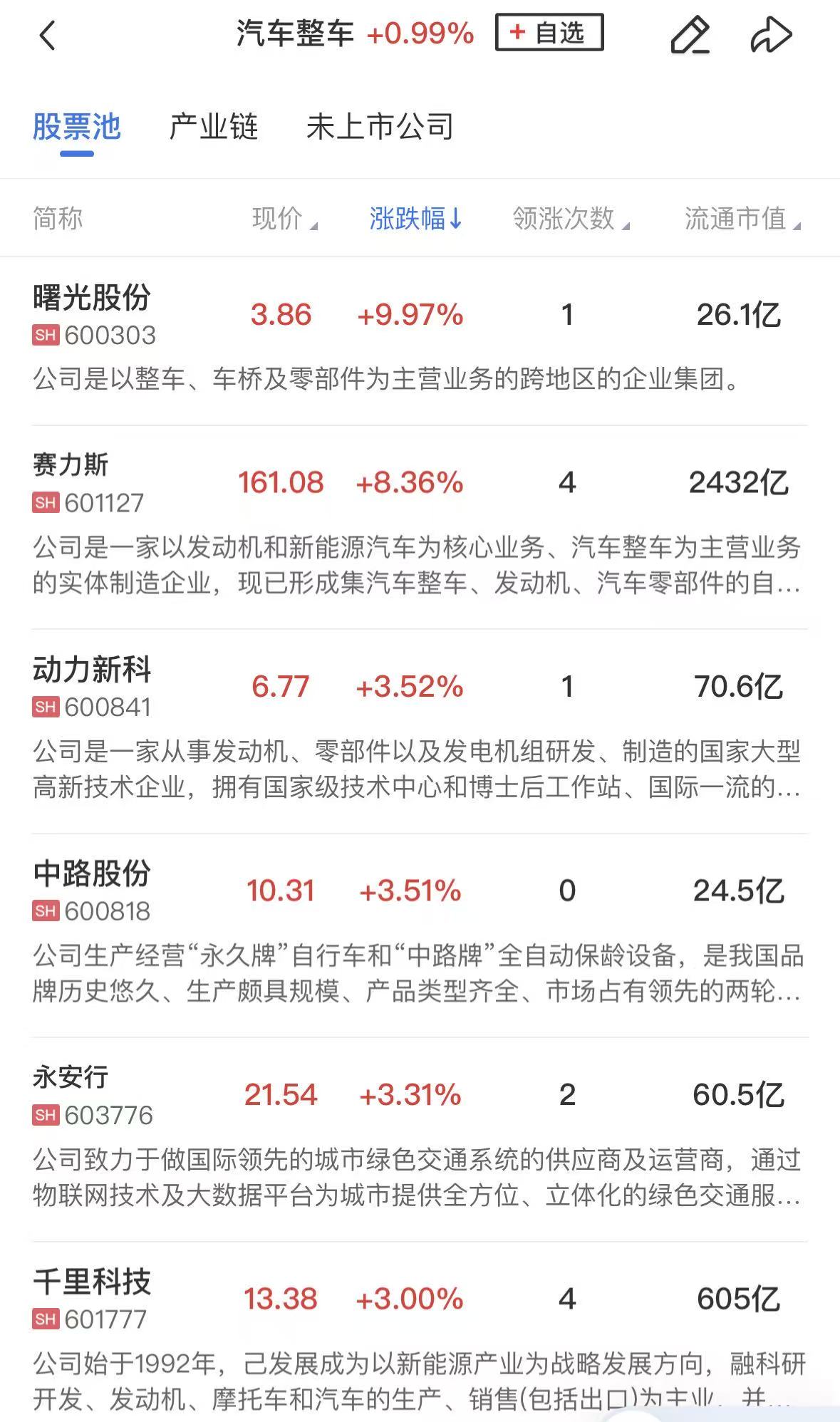汽车整车板块一度冲高,曙光股份涨停,赛力斯盘中触及涨停创下历史新高,长安汽车、中集车辆、金龙汽车等跟涨。消息面上,9月25日,赛力斯发布公告称,公司发行境外上市外资股(H股)获中国证监会备案。根据备案通知书,公司拟发行不超过3.31亿股境外上市普通股并在中国香港联合交易所上市。