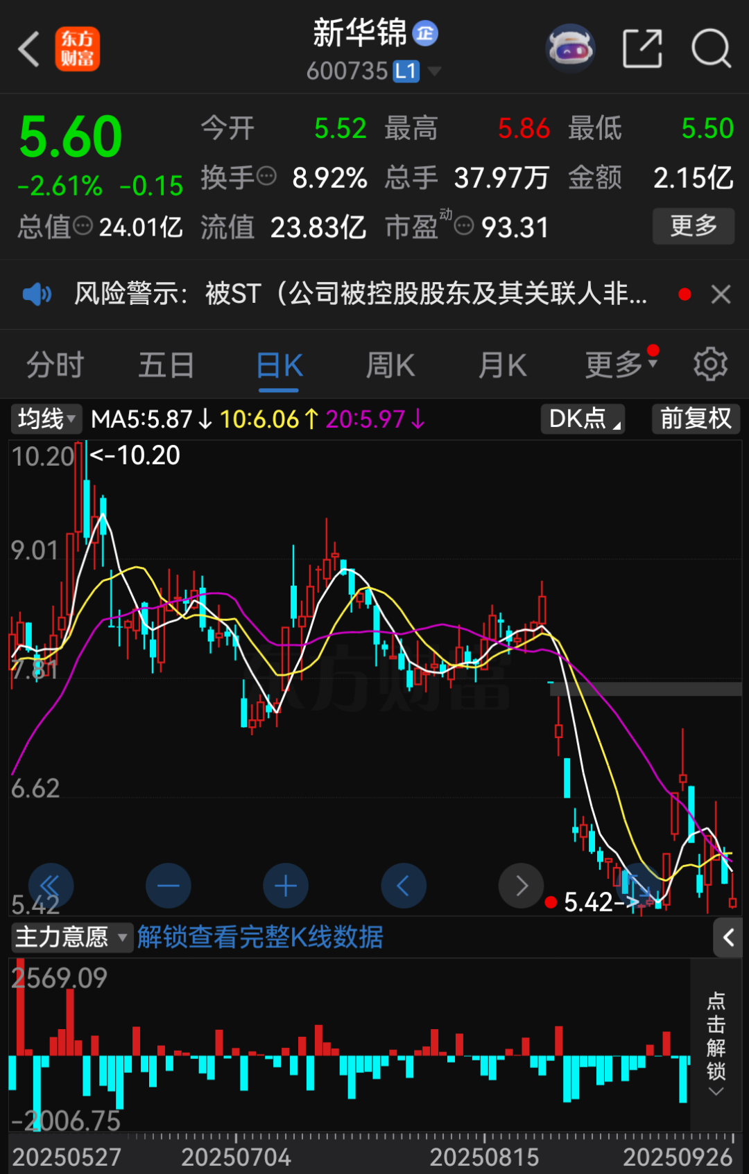 截至9月26日收盘,新华锦股价报5.60元/股,跌幅达2.61%,总市值为24.01亿元。截至6月30日,公司股东人数为2.285万户。