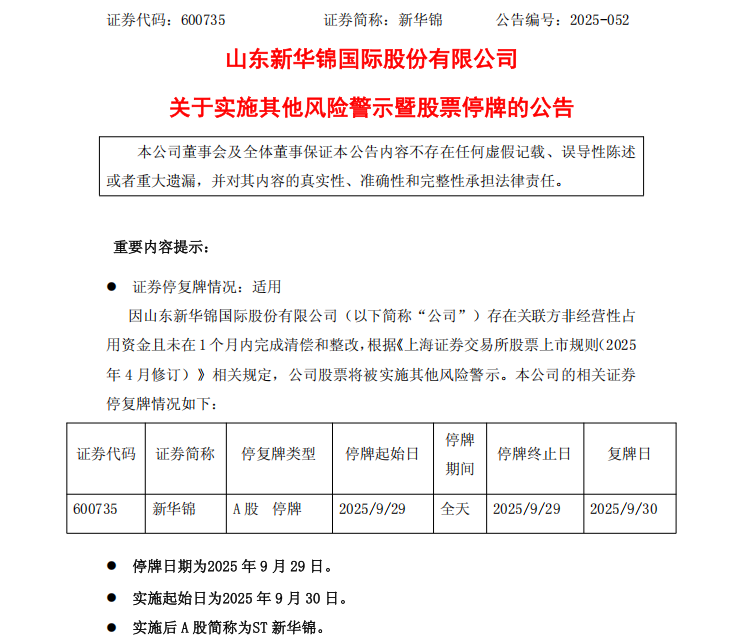 根据《行政监管措施决定书》及《上海证券交易所股票上市规则(2025年4月修订)》的规定,新华锦将被实施其他风险警示。
