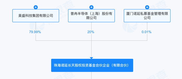 界面新闻查阅天眼查穿透信息发现,天眼查里珠海诺延的股权结构与普冉股份所披露的有所出入。天眼查信息显示,除了普冉股份持有20%,以及厦门诺延私募基金管理有限公司(以下简称“厦门诺延”)这位普通合伙人执行事务合伙人(0.01%)没变外,剩余的79.99%份额归昊盛科技集团有限公司(以下简称“昊盛科技”)所有。