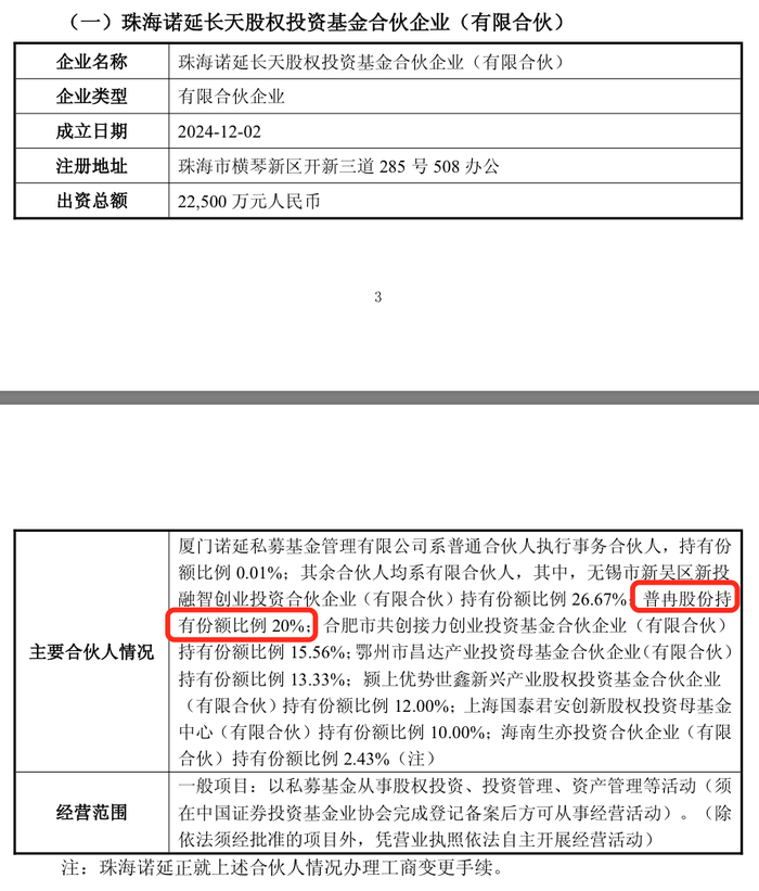 值得注意的是,在珠海诺延的股权结构中,也有普冉股份的身影,其持有20%的份额,作为有限合伙人参与其中。据悉,珠海诺延成立时间为2024年12月。