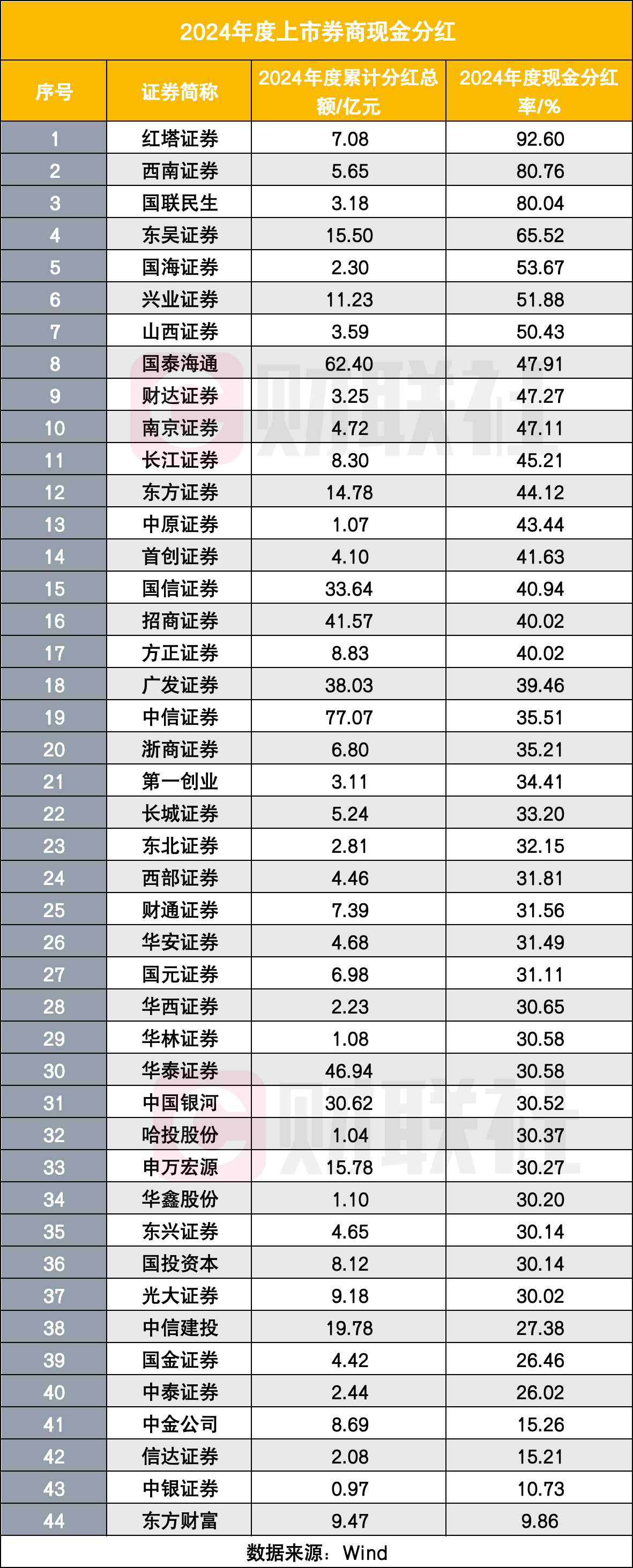 统计数据显示,2024年度共有44家券商披露了现金分红相关数据,其中37家券商的现金分红率超过30%,10家券商的现金分红率超过50%,3家券商的现金分红率超过80%,整体分红水平较为可观。