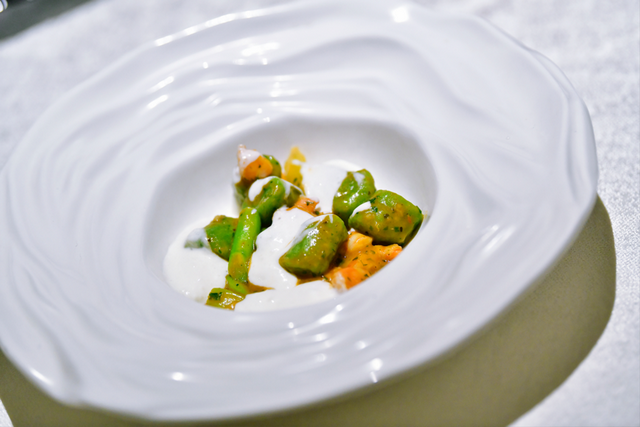 Nino主厨用充满感染力的笑容和手势向主持人介绍:“意大利菜讲究食材的本味和简单的烹饪手法。南京秋天的芦笋非常棒,虾也很鲜美。我想到用我们家乡一种叫做赛特拉的芝士,它香气浓郁但口感柔和,与土豆泥是绝配。这道菜我想表达的是,用意大利的方式,来呈现南京当地最新鲜的物产,这是一种很有趣的文化融合。” 他特别强调了火候对虾仁口感的重要性,“多一秒则老,少一秒则生”,其专业与专注赢得了现场阵阵掌声。这道菜入口,薯球的香酥、芝士的浓醇、芦笋的清新、虾仁的Q弹依次绽放,层次分明,展现了西餐精准控制下的味觉魅力。