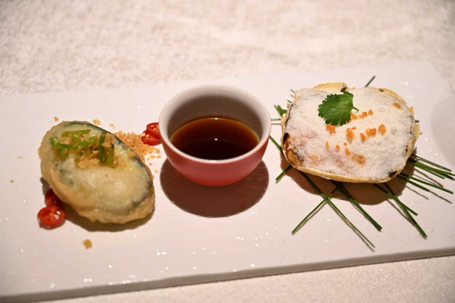 这道菜堪称对经典淮扬名菜“蟹粉芙蓉蛋”与“茄盒”的极致创意解构。王维浩主厨在直播镜头前,从容不迫地展示其精湛技艺。他选取肥硕圆润的紫长茄,巧手片成薄而不断的连刀片,内酿以特制的以豆腐、香菇、笋粒等制成的“素蟹粉”,口感仿真度极高,鲜美醇厚而不失清爽。外层裹上轻薄的面衣,炸至金黄酥脆。最画龙点睛之处,在于撒上的金蒜末与微量黑松露酱,瞬间提升了整道菜的香气层次感。而一旁的“芙蓉”并非寻常蒸蛋,而是极其细腻嫩滑的蛋清泡沫,宛若一朵飘浮的云彩,托起精致的“素蟹斗”。