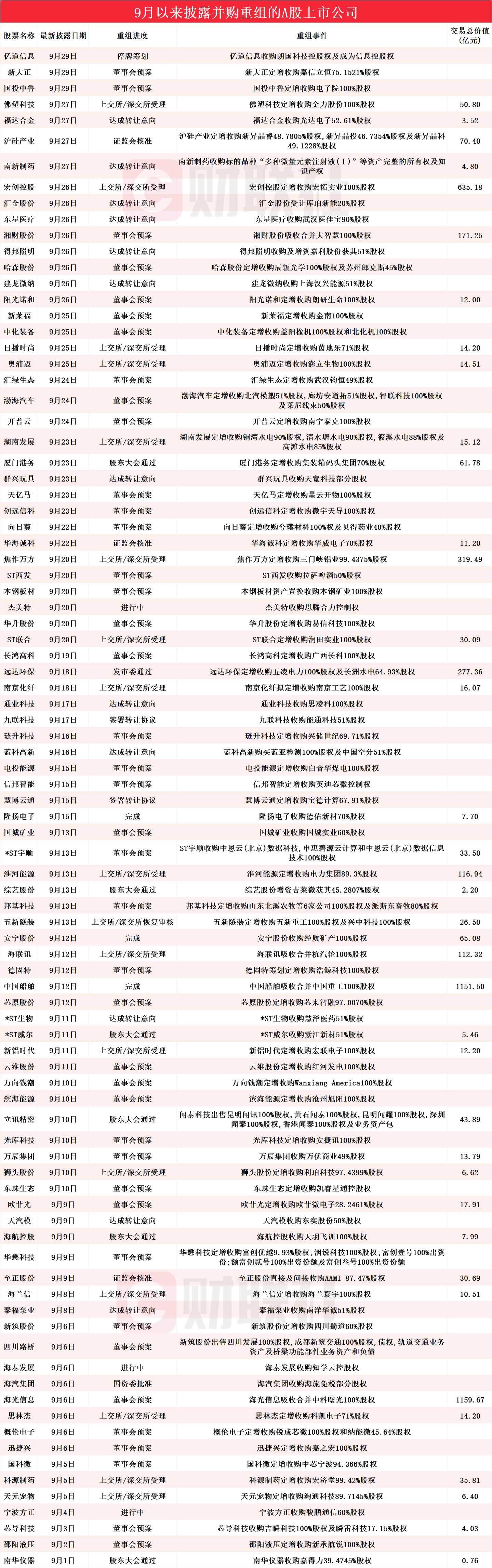据财联社不完全统计,并结合Wind数据,选取参与角色为竞买方,剔除重组失败,9月以来披露重大并购重组进展的A股上市公司共有90家,分别为亿道信息、新大正、国投中鲁、佛塑科技、福达合金、沪硅产业、南新制药、宏创控股、汇金股份、东星医疗、湘财股份、得邦照明、哈森股份、建龙微纳、阳光诺和、新莱福、中化装备、日播时尚、奥浦迈、汇绿生态、渤海汽车、开普云、湖南发展、厦门港务、群兴玩具、天亿马、创远信科、向日葵、华海诚科、焦作万方、ST西发、本钢板材、杰美特、华升股份、ST联合、长鸿高科、远达环保、南京化纤、通业科技、九联科技、琏升科技、蓝科高新、电投能源、信邦智能、慧博云通、隆扬电子、国城矿业、*ST宇顺、淮河能源、综艺股份、邦基科技、五新隧装、安宁股份、海联讯、德固特、中国船舶、芯原股份、*ST生物、*ST威尔、新铝时代、云维股份、万向钱潮、滨海能源、立讯精密、光库科技、万辰集团、狮头股份、东珠生态、欧菲光、天汽模、海航控股、华懋科技、至正股份、海兰信、泰福泵业、新筑股份、四川路桥、海泰发展、海汽集团、海光信息、思林杰、概伦电子、迅捷兴、国科微、科源制药、天元宠物、宁波方正、芯导科技、邵阳液压和南华仪器。具体情况如下图: