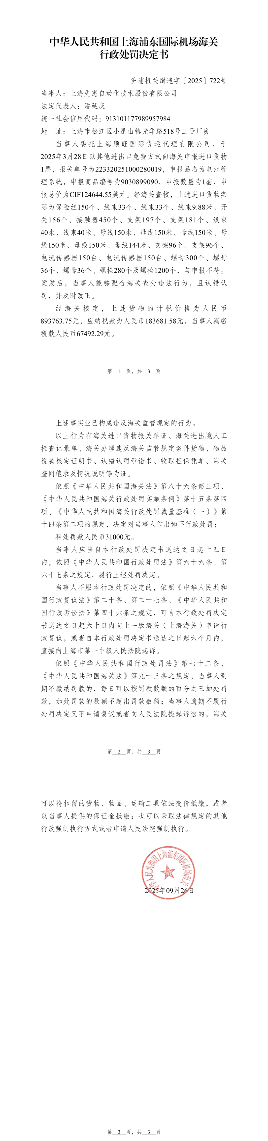 近日,中华人民共和国上海浦东国际机场海关发布关于上海先惠自动化技术股份有限公司违反海关监管规定行政处罚决定书(沪浦机关缉违字〔2025〕722号)。