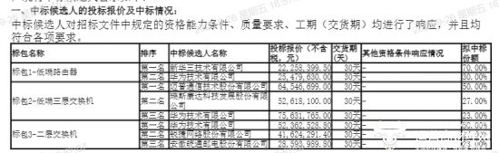 标包2:第一至第三位中标候选人分别为迈普通信、瑞斯康达、华为,拟中标份额分别为50%、27%、23%。其中华为报价75631765元,是三家中最高的;瑞斯康达报价52618100元,两者报价差距超过2300万元。