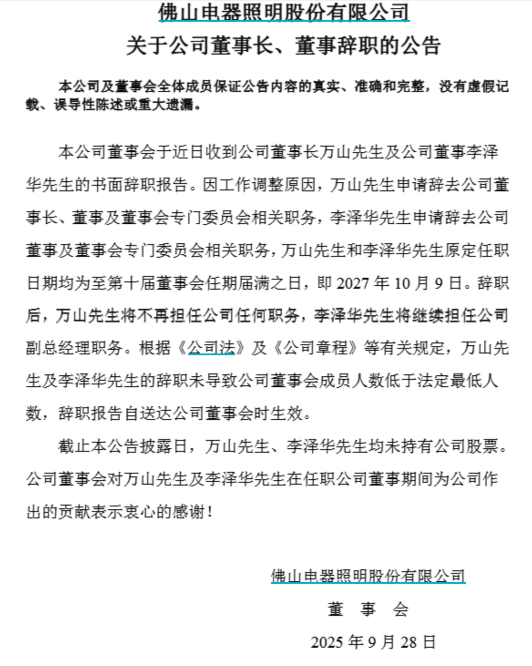 公告称因工作调整原因,万山申请辞去佛山照明董事长、董事及董事会专门委员会相关职务,李泽华申请辞去佛山照明董事及董事会专门委员会相关职务,二人原定任职日期均为至第十届董事会任期届满之日,即2027年10月9日。