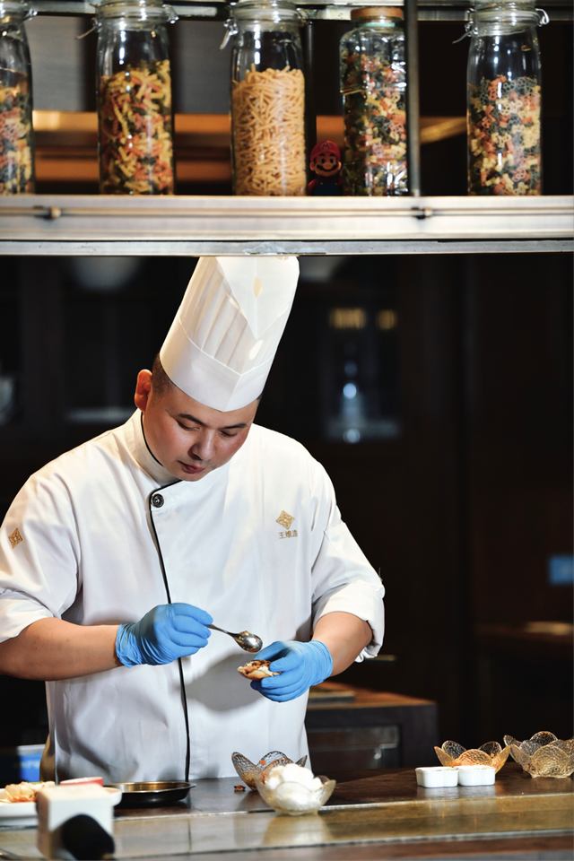 首位登场的是金陵饭店助理行政总厨王维浩,他在淮扬菜系领域深耕多年,功底扎实,尤其擅长在尊重传统的基础上进行现代演绎。他带来的金蒜松露茄夹芙蓉素蟹斗,一经亮相便成为焦点。