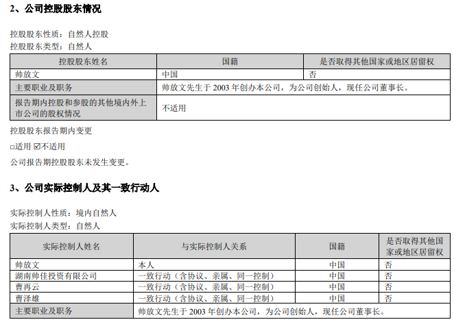 据尔康制药2024年年报,公司控股股东、实际控制人为帅放文,湖南帅佳投资有限公司、曹再云、曹泽雄系其亲属、一致行动人。帅放文与曹再云为夫妻关系。帅放文于2003年创办公司,为公司创始人,现任公司董事长。