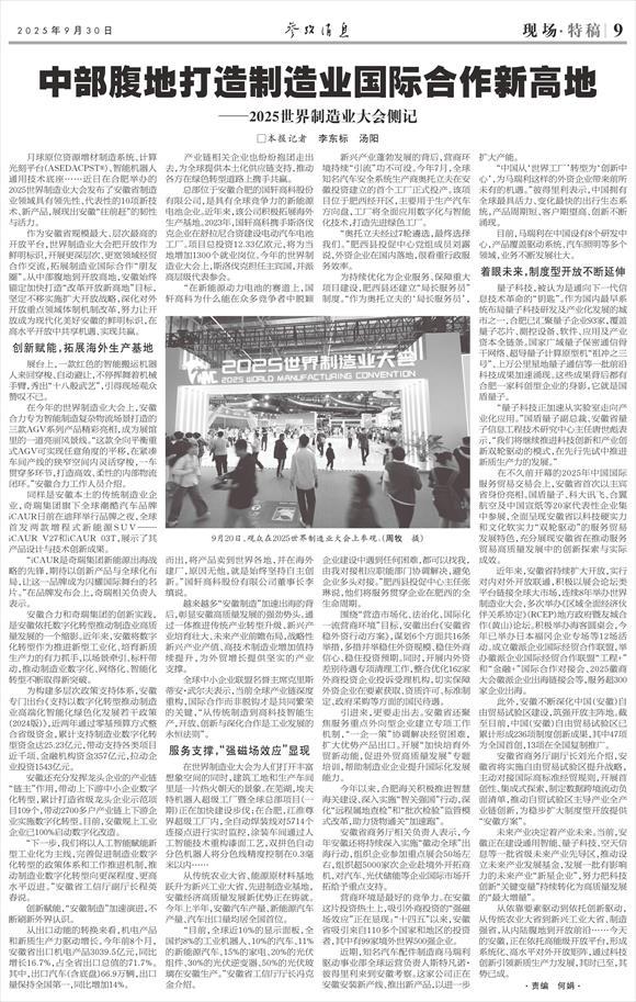 9月20日,观众在2025世界制造业大会智能网联新能源汽车展区参观(周牧 摄)近年来,安徽省持续扩大开放,实行对内对外开放联通,积极以展会论坛类平台链接全球大市场,连续8年举办世界制造业大会,多次举办《区域全面经济伙伴关系协定》(RCEP)地方政府暨友城合作(黄山)论坛。积极举办海客圆桌会,今年已举办日本福冈企业专场等12场活动。成立徽派企业国际经贸合作联盟,举办徽派企业国际经贸合作联盟“工程+”和“金融+”国际合作对接会、2025徽商大会徽派企业出海链接会等,服务超300家企业出海。