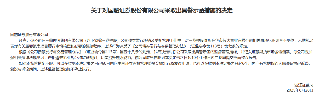 浙江证监局指出,国融证券应加强相关法律法规学习,严格遵守执业规范和监管规则,切实提升履职能力。公司应当在收到决定书之日起10个工作日内提交书面整改报告。