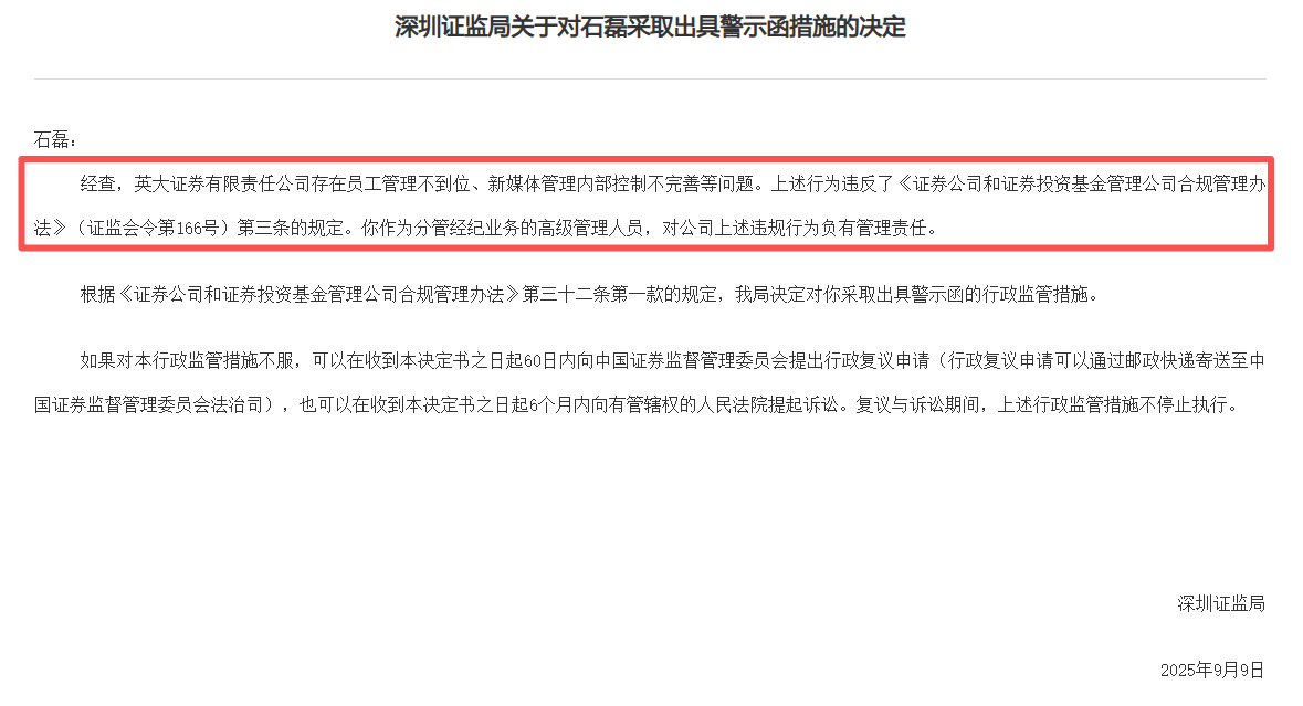 深圳证监局披露罚单指出,英大证券存在员工管理不到位、新媒体管理内部控制不完善等问题。作为分管经纪业务的高级管理人员,石磊对公司上述违规行为负有管理责任。