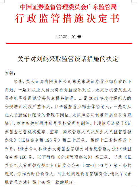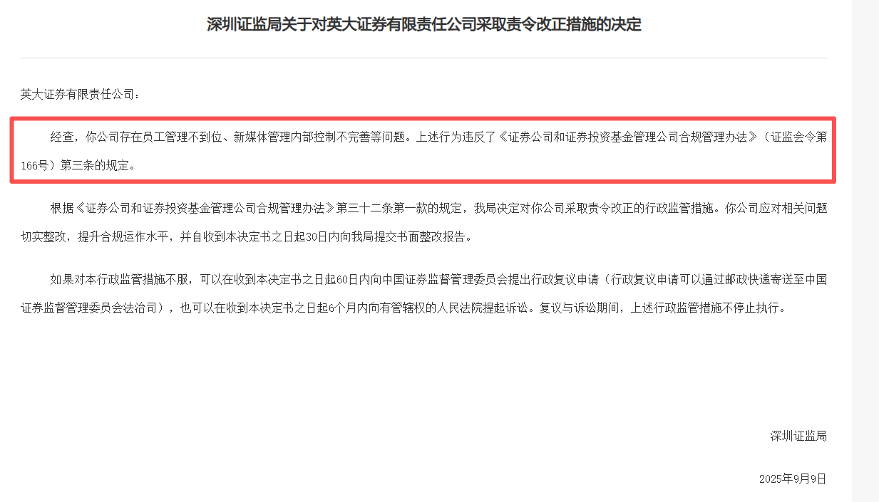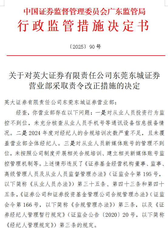 英大证券:公司被采取责令改正措施,东莞东城证券营业部被采取责令改正措施,从业人员刘彪被采取认定为不适当人选监管措施,营业部时任负责人刘鹤被采取监管谈话措施,公司分管经纪业务高管石磊采取出具警示函措施。