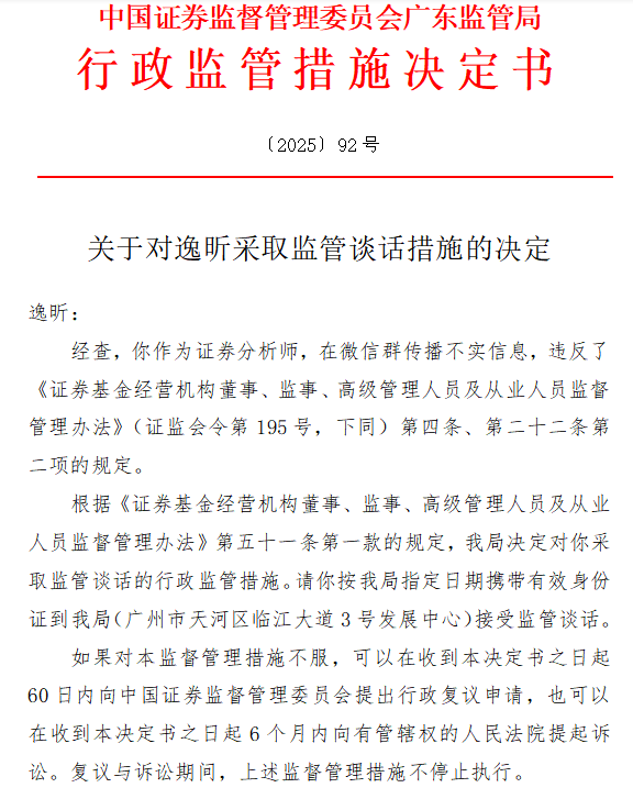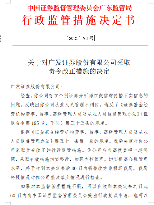 广发证券:公司被采取责令改正措施,证券分析师逸昕被采取监管谈话措施。
