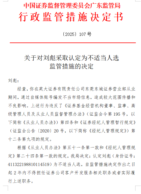 刘彪在英大证券东莞东城证券营业部从业期间,通过自媒体账号编发不当市场信息,造成较大范围传播和不良影响。广东证监局认定刘彪为不适当人选,自监管措施决定作出之日起2年内不得担任证券公司客户开发服务相关职务或者实际履行上述职务。