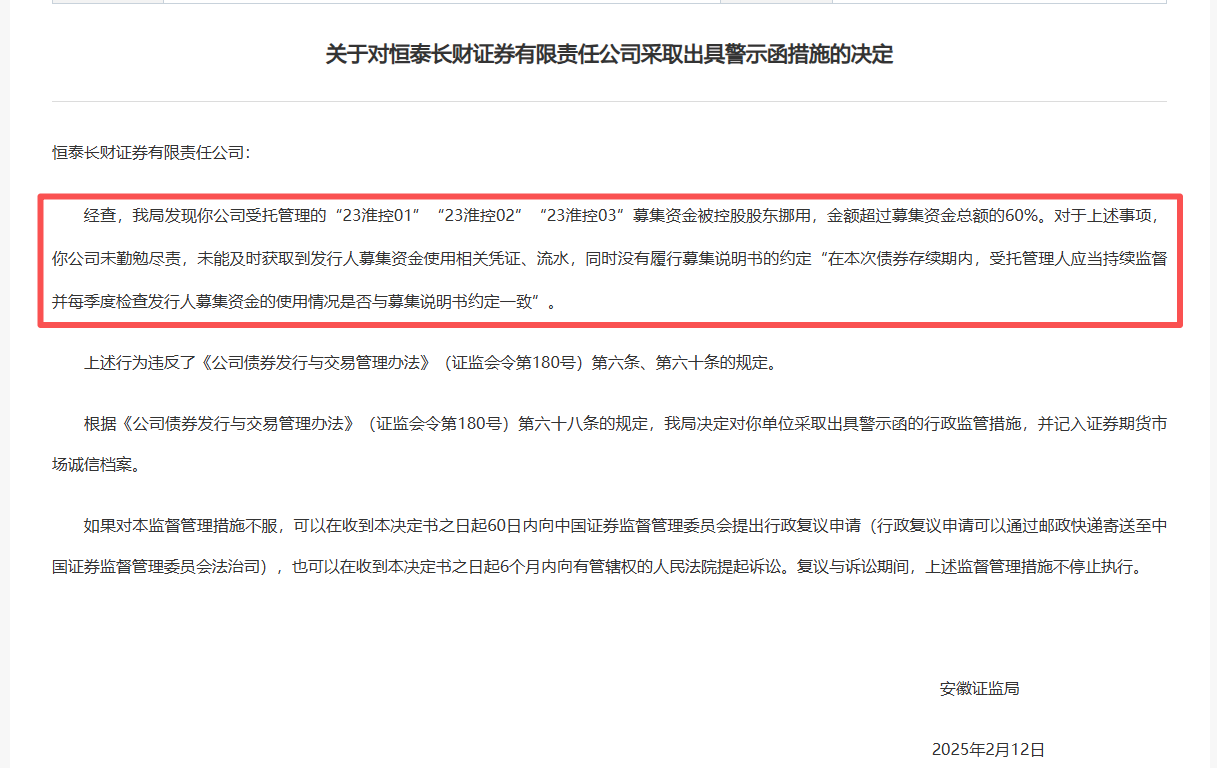 罚单显示,恒泰长财证券受托管理的“23淮控01”“23淮控02”“23淮控03”募集资金被控股股东挪用,金额超过募集资金总额的60%。