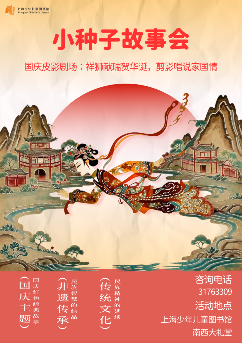 10月1日,南西馆的皮影盛宴值得期待,当天10:20-11:10、14:00-14:50两场“种子故事会:国庆皮影剧场”,将以“祥狮献瑞贺华诞,剪影唱说家国情”为主题,用非遗皮影戏搭配幕布舞台,为4-10岁亲子家庭呈现舞狮表演、传统寓言与中国鼓演绎。现场还将展示一系列与皮影传统和光影技艺相关的绘本图书,助力孩子们在感受传统文化魅力的同时,更好地理解皮影背后的科学知识。