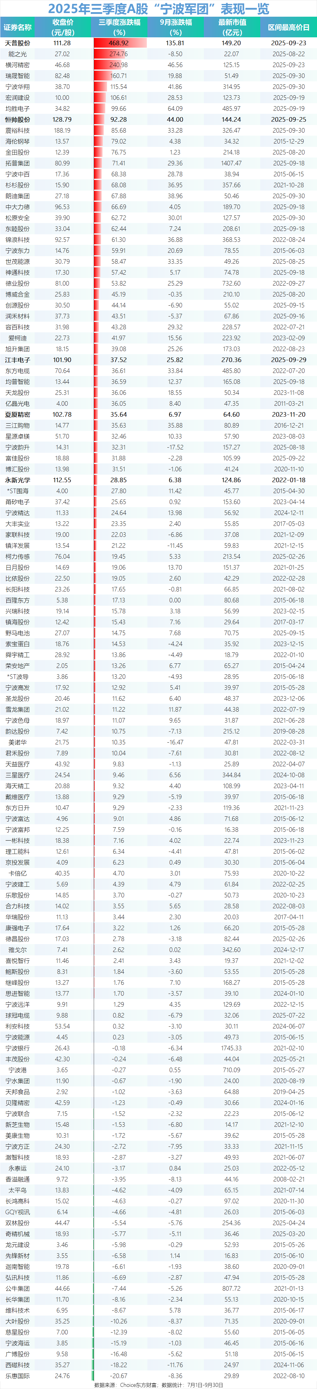 截至9月30日收盘,第三季度,3887只个股上涨。“宁波军团”也走出普涨行情,超七成甬股上涨,近半数跑赢沪指。其中,6只甬股股价翻倍(剔除新股能之光),天普股份、瑞晟智能、横河精密涨幅居前,分别为468.92%、240.98%、160.71%。