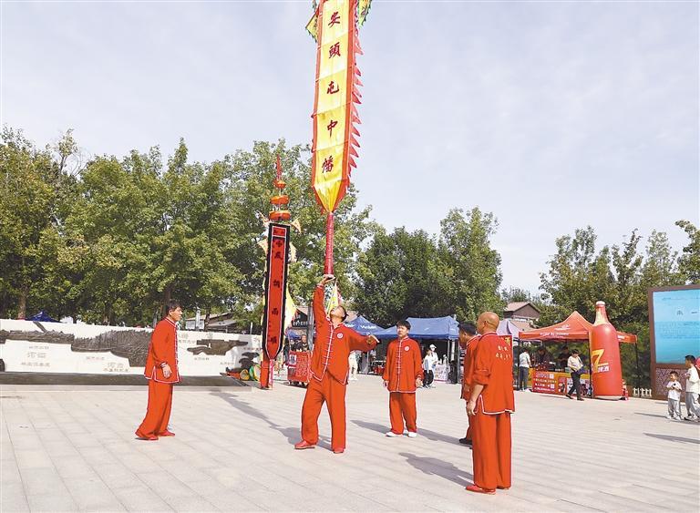 ▲北运河香河中心码头,民间艺人在表演中幡。