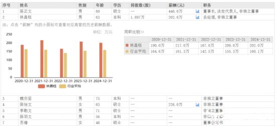 在公司去年利润下降的情况下,公司公布薪酬的高管却纷纷上涨,只有总经理林昌钰的薪酬有所下降。林昌钰2024年薪酬为202.0万元,相较于2023年的209.0万元,微降了7万元,是董事长陈正文薪酬的一半不到。陈正文2024年薪酬为440.0万元,相较于2023年的392.0万元,上涨了48万元。