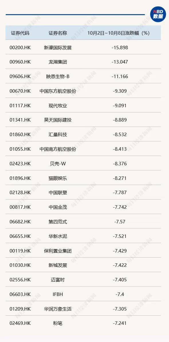 港股通标的10月2日~10月8日累计跌幅TOP20