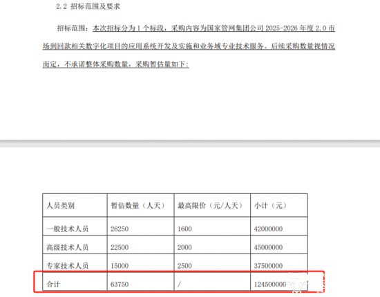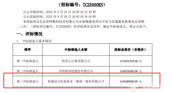 值得一提的是,第三中标候选人软通动力投标报价为124500000元,“顶格报价”,和项目总预算一分不差,这样的情况还是不太常见的。最后软通动力也没中标,因为标书上写着“最多两家入围”。