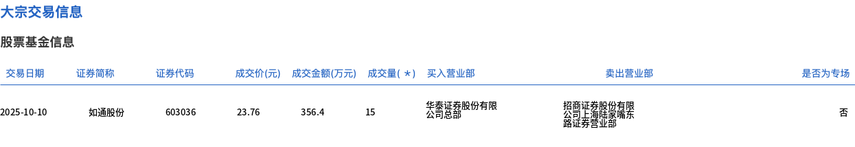 10月10日,如通股份(维权)大宗交易成交15万股,成交额356.4万元,占当日总成交额的0.67%,成交价23.76元,较市场收盘价23.76元持平。