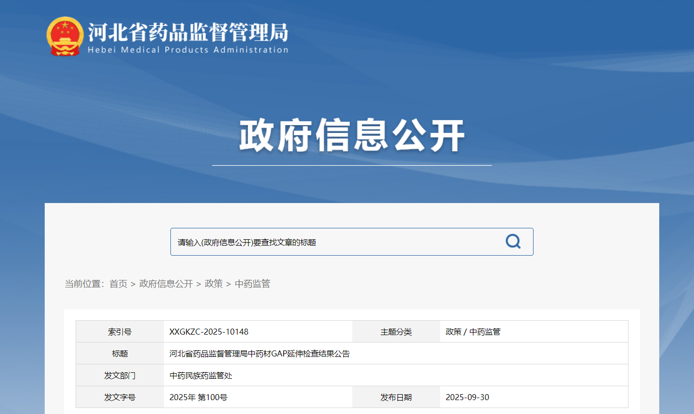 根据《国家药监局农业农村部国家林草局国家中医药局关于发布〈中药材生产质量管理规范〉的公告》(2022年第22号)要求,按照《河北省中药材生产质量管理规范检查工作程序(试行)》(冀药监中药〔2024〕30号)规定,我局组织对神威药业集团有限公司川芎种植基地、安国圣山药业有限公司半夏种植基地、石家庄以岭药业股份有限公司金银花种植基地进行了《中药材生产质量管理规范》延伸检查,经综合评定检查结果符合要求,现予以公告。