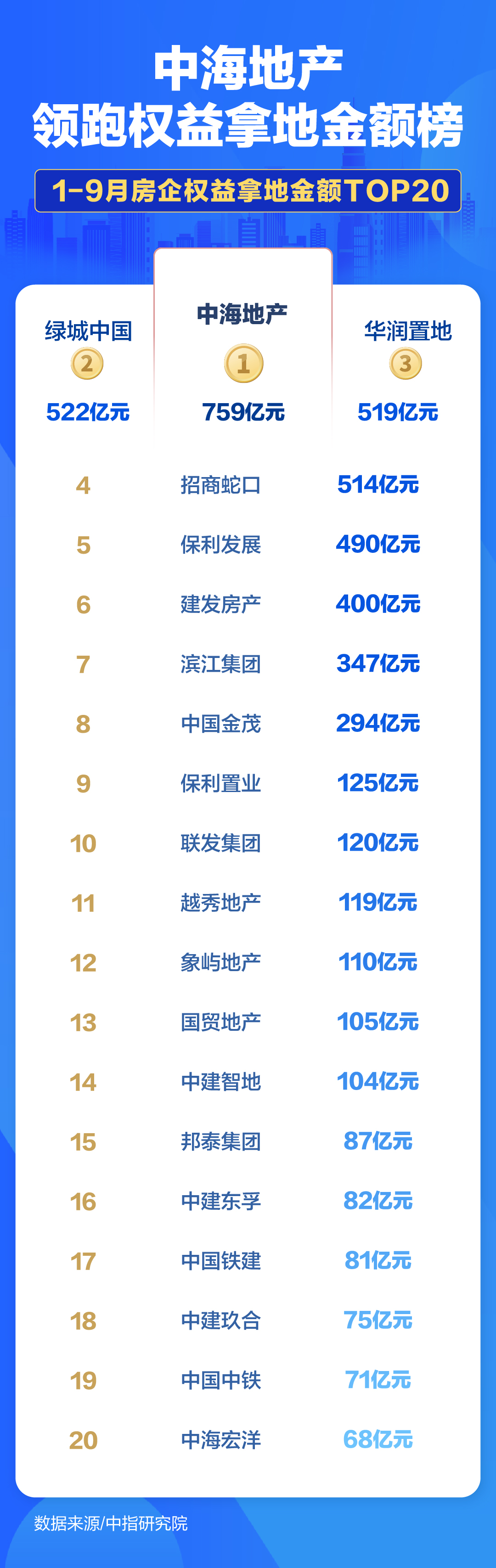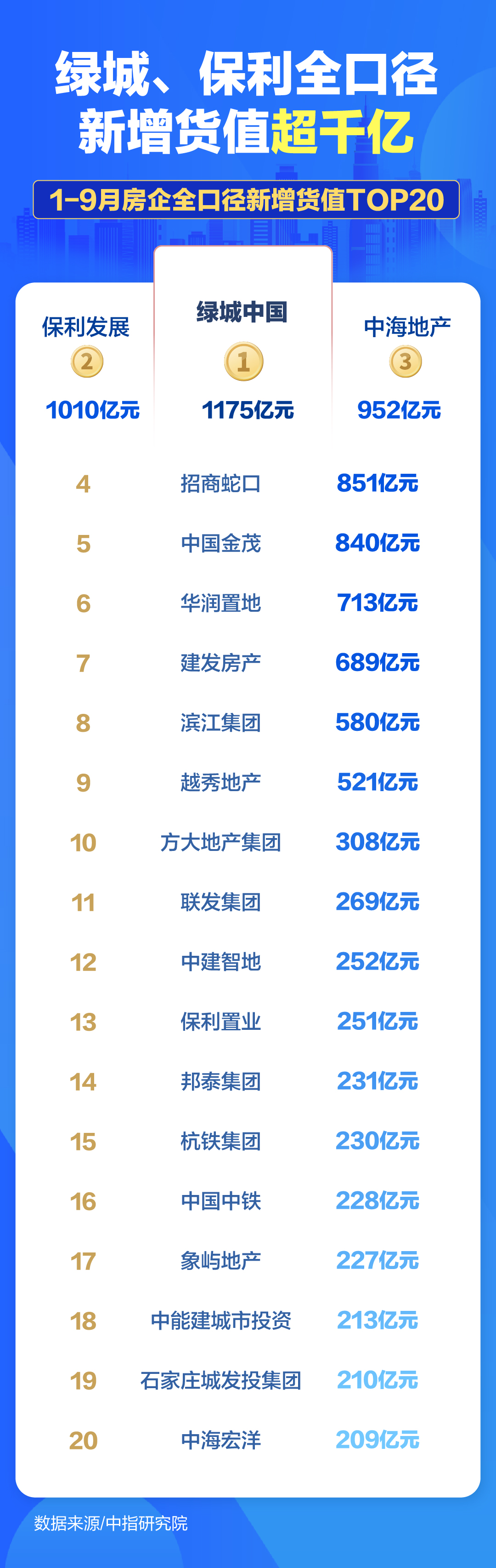 头部房企的拿地力度持续加强。从新增货值来看,1-9月,绿城中国(简称“绿城”)、保利发展(简称“保利”)和中海地产位列前三,分别为1175亿元、1010亿元和952亿元。而从权益拿地金额来看,中海地产、绿城、华润置地位列前三。
