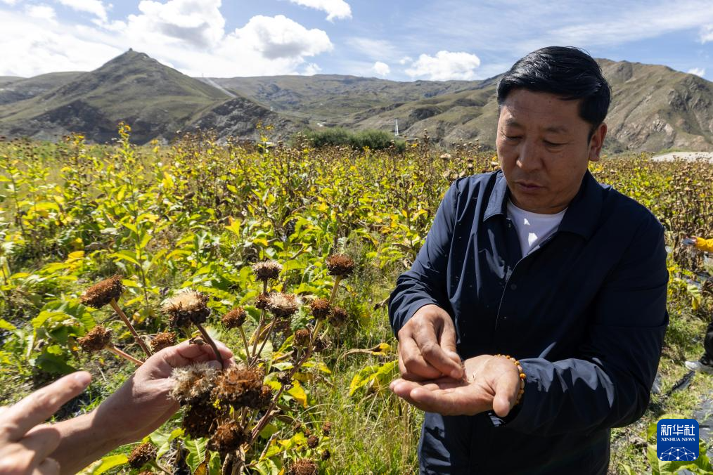 在西藏山南德诺农林产业开发有限责任公司的种植基地,公司总经理普巴在查看藏药材草红花的长势(9月18日摄)。新华社记者 姜帆 摄