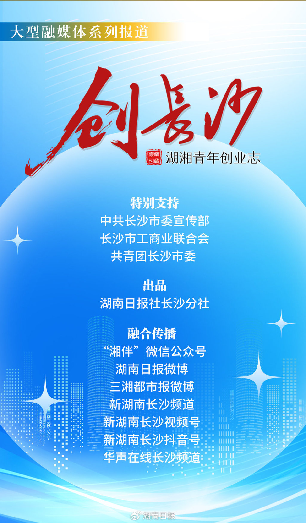 “背着双肩包就可以来湖南创业!”湖南求贤若渴、热情邀约。青春之城长沙,如何与青青力量双向奔赴、同频共振?中共长沙市委宣传部、长沙市工商业联合会、共青团长沙市委特别支持,2025年7月,湖南日报社长沙分社重磅推出《创长沙》大型融媒体报道,聚焦青春力量扎根长沙、建设长沙的生动实践,呈现这座城市向善向美、茁壮成长的壮阔气象。敬请关注!