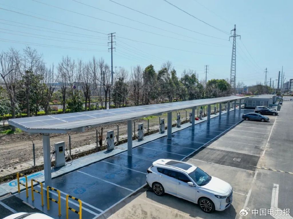 ▲3月26日,江苏省规模最大的工业园区微电网项目在常州武进建成投运,多项创新示范技术在此落地应用。图为位于该园区内的光储充一体化充电区。