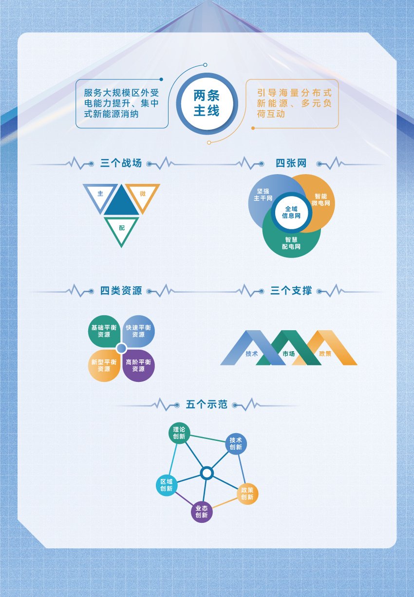 国网江苏电力立足国情省情网情,探索形成了新型电力系统建设的总体思路:围绕“服务大规模区外受电能力提升、集中式新能源消纳”和“引导海量分布式新能源、多元负荷互动”“两条主线”,聚焦主、配、微“三个战场”,打造坚强主干网、智慧配电网、智能微电网、全域信息网“四张网”,开发煤电等基础平衡资源、电化学储能等快速平衡资源、荷端等新型平衡资源、长时储能等高阶平衡资源“四类资源”,强化技术、市场、政策“三个支撑”,建设理论创新、技术创新、政策创新、业态创新、区域创新“五个示范”,探索安全、绿色、经济综合最优发展之路。在此过程中,国网江苏电力积极推动电源、电网、负荷、储能、技术、市场、政策“七大要素”协同发展、随“新”而动,为其他地区能源转型提供先行经验。