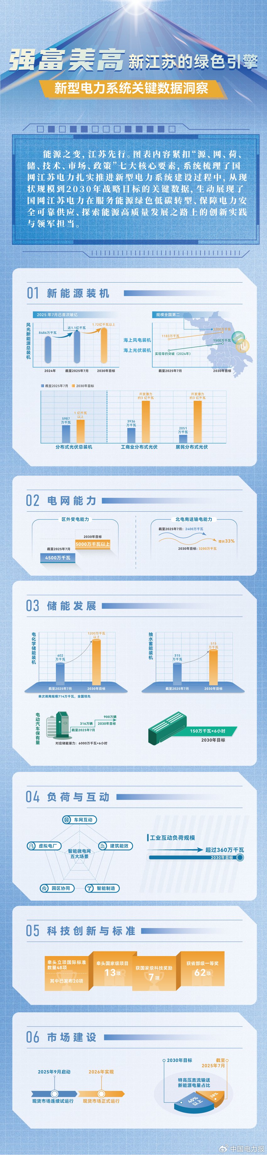市场机制建设是实现资源高效配置、促进产业发展的有力抓手,是新型电力系统建设的核心内容。国网江苏电力积极配合政府推动构建“容量+能量(中长期/现货)+辅助服务+绿色”的多层次统一市场体系,努力为新型电力系统建设提供更强支撑。一是推动容量市场发展。在全国统一电力市场框架体系下,围绕多时间尺度电力电量平衡需要,探索构建满足新型电力系统调节需要的容量市场、规划明确未来电力系统容量需求,创新江苏容量市场机制,激励煤电深调、荷端、储能等可调资源开发。二是推动能量市场发展。在已经建成全国规模最大省级电力中长期市场、2025年9月已启动现货市场连续试运行的基础上,进一步加快现货市场建设,2026年实现正式运行;配合政府部门出台国家发改委136号文省内实施细则,建立“市场交易+差价结算”新能源价格机制。三是推动辅助服务市场发展。持续健全调频、爬坡、惯量等辅助服务市场品种,配套完善成本分摊和收益共享机制,在分布式光伏、电动汽车、虚拟电厂参与辅助服务市场的基础上,打造分布式新能源聚合参与省级交易、电动汽车聚合参与省级交易等典型示范,支撑提高新型电力系统调节能力。四是推动绿色市场发展。在首创“电力交易大厅—绿电绿证服务站—服务点”三级绿电服务网络的基础上,实施绿电进江苏、进园区、进企业的“三进”工程;加强欧盟碳边境调节机制2026年正式运行后的外向型企业绿电需求研究,持续创新碳计量、碳足迹跟踪等碳普惠服务,助力增强江苏外向型经济国际竞争力。