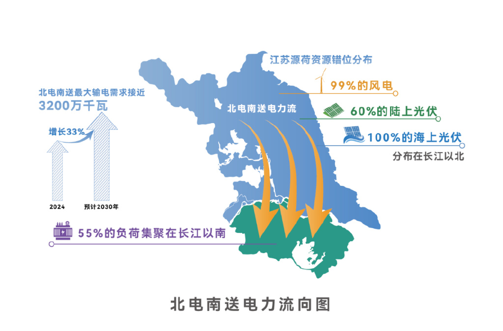 一是新能源大规模接入和大范围优化配置压力加剧。从大规模海上风光开发来看。江苏东临黄海,海域水浅、底平、坡缓,便于经济高效地开发固定式海上风电光伏,海风、海光开发潜力分别超过6000万千瓦、2700万千瓦。截至2025年7月底,已开发海上风电1183万千瓦、规模全国第二,预计2030年海上风电达2200万千瓦、海上光伏达1500万千瓦。随着大规模海上风光开发逐步深入,受海上输电廊道和登陆点资源严重紧缺影响,将呈现海上电源汇集结构树形化、海上电力送出能力规模化、陆上电网接入方式立体化等特点。在此过程中,海上大容量汇聚场站小型化建设难度大,海上输电特高压海缆制造和敷设技术尚处于空白,海陆潮流分布“双喇叭”形态容易导致集中登陆点电网设备超限承压。如不创新现有规划模式,海上风光接入超过4000万千瓦,将达到电网的承载极限。需要配合政府部门统筹布局海上输电廊道资源使用,开展海上电源汇聚网络规划,推动特高压海缆技术装备研发和示范工程实践,组织海上风光登陆多层级多路径大纵深高效疏散网架设计研究,增强大规模海上风光资源接入保障能力。从海量分布式新能源发展来看。江苏是制造业强省,省级以上开发区158家、数量全国第一,制造业法人56.9万个,数量全国第二;同时也是农业大省,农村房屋超过3400万栋、数量全国第四。丰富的屋顶资源为分布式光伏发展提供了良好条件,开发潜力超过6亿千瓦,截至2025年7月底,总装机5987万千瓦、规模全国第一。在工商业分布式光伏资源开发方面。随着午间谷时电价和新能源全量入市政策的实施,工商业午间用电价格将显著下降,分布式光伏自发自用模式收益将大幅收窄、投资意愿相应下滑,以工业园区集中开发全额上网为代表的规模化开发模式,有望成为分布式光伏发展的新趋势。放眼未来,大规模园区级分布式光伏集中接入后,接入变电站可能存在反向倒送容量不足、所在电网分区疏散能力不够、电压波动治理难度加大等问题。以全省工业园区工作日平均负荷47万千瓦、节假日平均负荷16万千瓦为例,如园区分布式光伏资源全部集中开发全额上网,预计平均水平为39万千瓦,节假日上网潮流可能达到工作日下网潮流的2.8倍,导致常规规划建设的变电站主变和线路严重超载,且高电压问题十分突出;如所在分区富余电力不能有效疏散,将导致上级主变出现重超载问题。需要配合政府科学做好工商业分布式光伏发展规划,创新开展适应园区级分布式光伏集中接入的电网建设方案研究,合理提高园区供电区域主配网设备容量裕度,加强分区间“背靠背”直流建设进而提高互济能力,开展基于边储存边疏散的分布式储能优化配置方案研究,完善终端电压治理手段,保障大规模分布式光伏高效开发、充分消纳。在居民分布式光伏资源开发方面。从现阶段看,居民分布式光伏地域分散,以农村居民屋顶光伏为主,开发呈现“小、零、散”特点,可能带来电网重复投资、制约光伏资源高效开发、接网设备质量参差不齐、影响农民收益和政府税收等方面的问题。需要加快“整村连片”开发推广应用,推动地方政府统一规划、整村资源统一开发、电网企业统一接入、居民权益统一保障。从未来看,海量居民分布式光伏集中接入电网,如现有配网规划建设标准未能得到优化,午间大发倒送潮流将导致配网大量超重载、配网设备故障高发、电能质量不合格率急剧升高。以徐州市庙山村为例,当地已有128户、占比13%的居民安装了屋顶光伏,平均每户装机42.6千瓦,光伏总装机5450千瓦、接近配变总容量6830千伏安的80%。若该村分布式光伏资源全部开发,理论装机可增至现在的8倍,远超配网承载能力。需要开展适应集中化开发的配网建设标准研究,设计不同类型的典型汇聚模式,加强“四可”能力建设和无功设备配置,提升电网对海量居民分布式光伏资源接入的支撑能力。从北电南送输电瓶颈来看。省内资源错位分布,99%的风电、100%的海上光伏、60%的陆上光伏分布在长江以北,55%的负荷集聚在长江以南,预计2030年北电南送最大输电需求接近3200万千瓦、较2024年底增长33%。需要加快北电南送过江通道建设,增强资源优化配置能力。