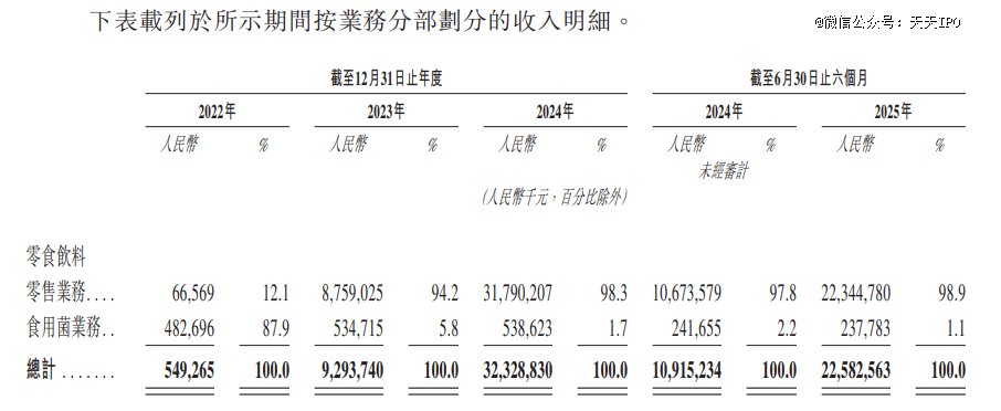 值得一提的是,从2022年至2024年,以及2025年前半年,两部分业务的营收占比发生了翻天覆地的变化。2022年食用菌产品收入占比达87.9%,一年后这一数字为5.8%,到2025年上半年仅剩1.1%;而零食饮料零售业务则从起初12.1%一路扩大到2025年上半年的98.9%。