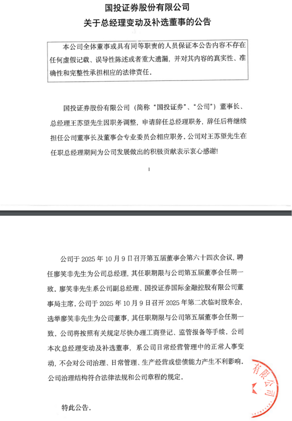 10月13日,国投证券发布第五届董事会第六十四次会议决议公告,两项重要任命内容:一是因职务调整,董事长王苏望不再兼任总经理职务,辞任后将继续担任公司董事长及董事会专业委员会相应职务;二是聘任副总经理廖笑非为公司总经理。