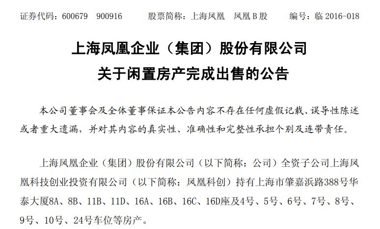 需要指出的是,这并不是上海凤凰上市以来首次处置闲置房产——早在2016年,上海凤凰全资子公司上海凤凰科技创业投资有限公司就通过公开拍卖处置了其持有的上海市肇嘉浜路388号华泰大厦多处房产及车位。