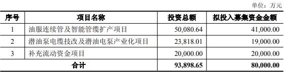 本次向不特定对象发行发行可转换公司债券拟募集资金总额不超过80,000.00万元(含本数),扣除发行费用后,募集资金净额拟投资于油服连续管及智能管缆扩产项目、潜油泵电缆技改及潜油电泵产业化项目、补充流动资金项目。