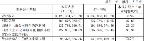 据公司2025年半年报,报告期内,公司实现营业收入34.25亿元,同比增长12.95%;归属于上市公司股东的净利润1.38亿元,同比增长29.30%;扣除非经常性损益后的净利润1.28亿元,同比减少38.34%;经营活动产生的现金流量净额9437.68万元。