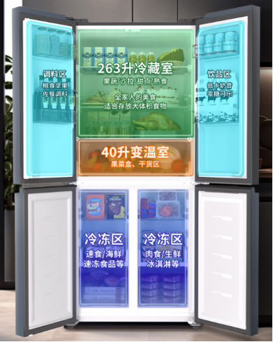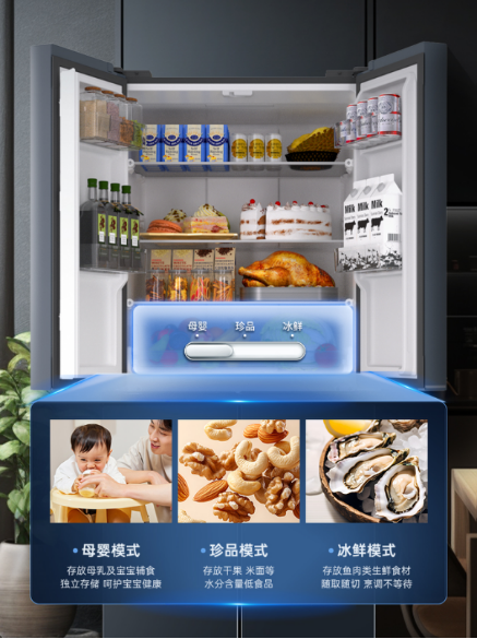 澳柯玛BCD-475WPHXFE烟青冰箱具备475升的储存空间,263升冷藏室+40升变温室+172升冷冻空间,可以满足大容量秋季食材的储存需求。无论是水果蔬菜还是肉类海鲜,冰箱都能提供充足的空间供我们进行囤货。超大隔层,即使是蛋糕、西瓜等大件物品也能放下,冷冻区独立使用,告别雪糕和海鲜串味的烦恼;变温室还具备母婴、珍品、冰鲜三种模式,可根据自身存储需求随意调节。